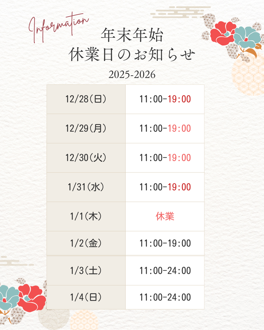 サロンのNEWS · 2025/12/04 年末年始の営業のお知らせ 🎍年末年始の営業時間のお知らせ🎍です 例年、年末年始はご予約が取りにくくなります🙏 可能なお客様はお早めにご予約ください(^^) tagPlaceholderカテゴリ: コメントをお書きください コメント: 0